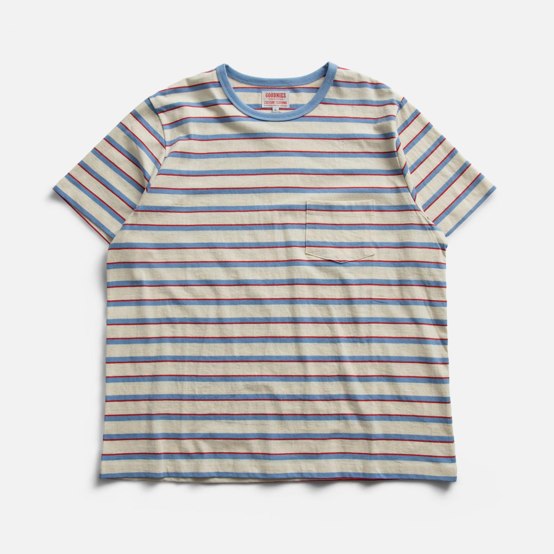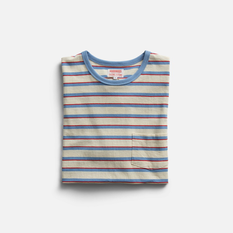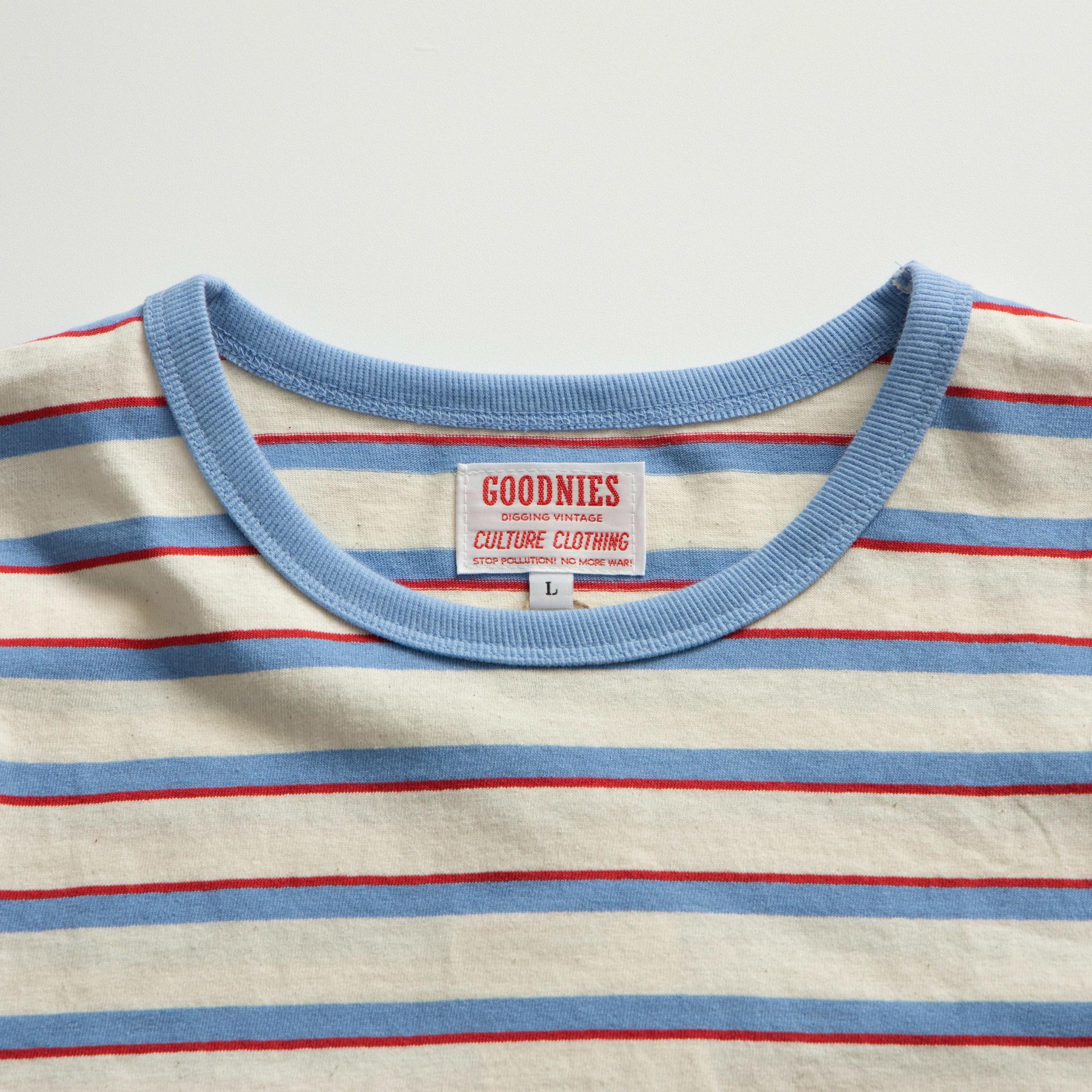 80년대 서퍼, 스케이트보더들이 자주 착용했던 빈티지 스트라이프 티셔츠에서 영감을 받아 만들어진 GOODNIES의 스트라이프 티셔츠입니다. Cotton 100% 20수 싱글 원단은 두껍지는 않지만 고밀도로 짜여진 부드러운 터치감으로 당시의 무드를 재현해내고 있습니다. 빈티지 스트라이프 티셔츠 중에서도 가장 좋은 밸런스를 가진 개체를 기반으로 재해석된 GOONIES만의 실루엣이 돋보입니다.