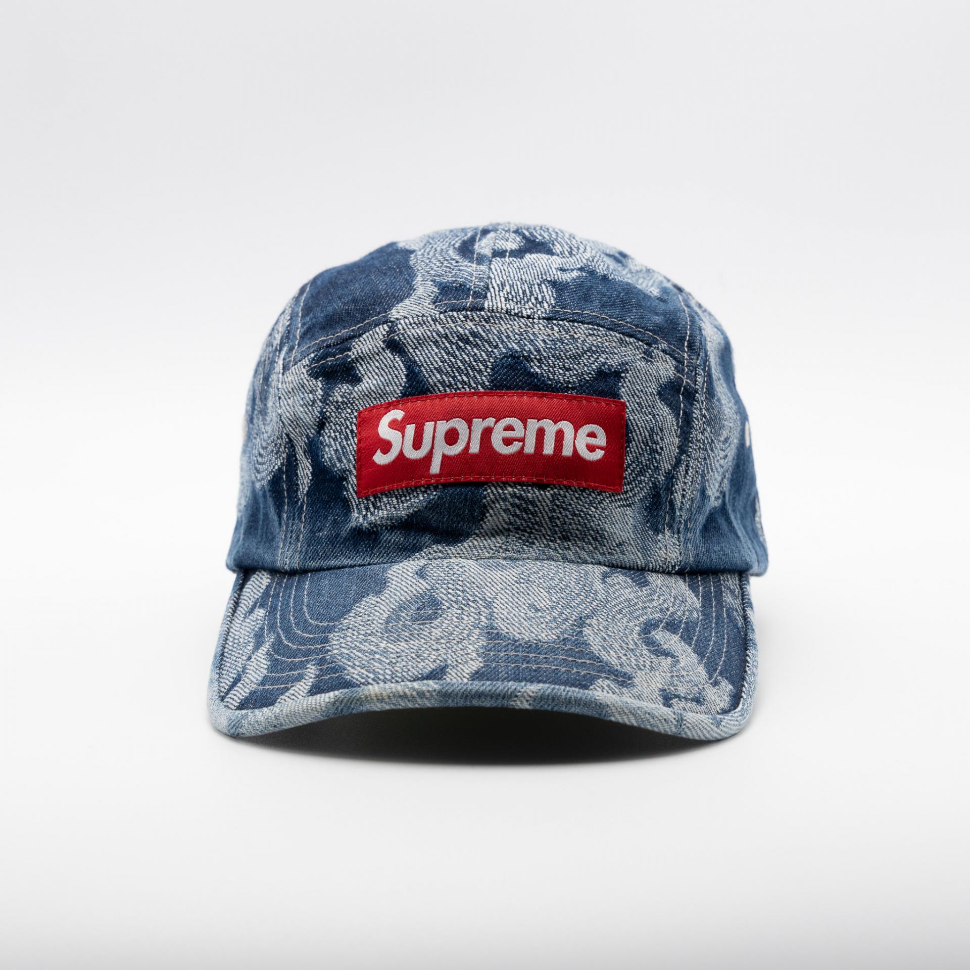 SUPREME FLAMES JACQUARD DENIM CAMP CAP WASHED INDIGO 23SS